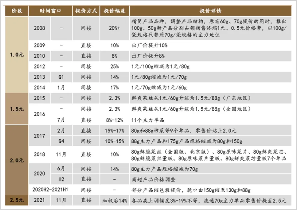 据德邦证券统计,2008年到2021年的13年间,涪陵榨菜进行了16次涨价,方式包括直接提价和间接提价两种方式。