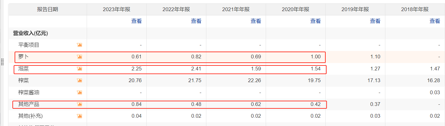公司榨菜类销量已从高峰时期的13.56万吨减至11万吨。数据显示,榨菜类产品2019年到2023年的销量分别为11.86万吨、13.56万吨、13.48万吨、11.78万吨和11.33万吨。