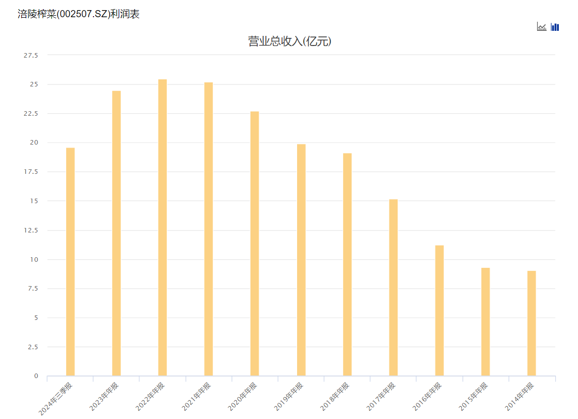 然而,实际上,自2021年以来,涪陵榨菜营收就在25亿元上下浮动。