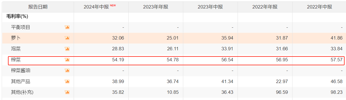 数据显示,截至2024年上半年,泡菜(除萝卜、海带丝外的其他下饭菜及全部瓶装产品)贡献营收1.29亿元,占营收的比重达9.91%;萝卜(袋装萝卜)仅贡献了0.24亿元的营收,占营收的比重仅为1.83%;其他(主要为海带丝+榨菜酱)实现营业收入0.334亿元,营收占比2.56%。