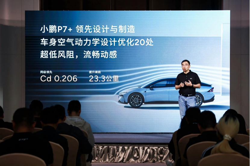 小鹏P7+整车共进行了20处风阻优化,比如后视镜壳体弧度、后视镜镜柄厚度都进行了毫米级处理,加上600次3000小时的仿真优化和三轮风洞试验,整车风阻低至Cd 0.206,续航因此提升了23.3km。