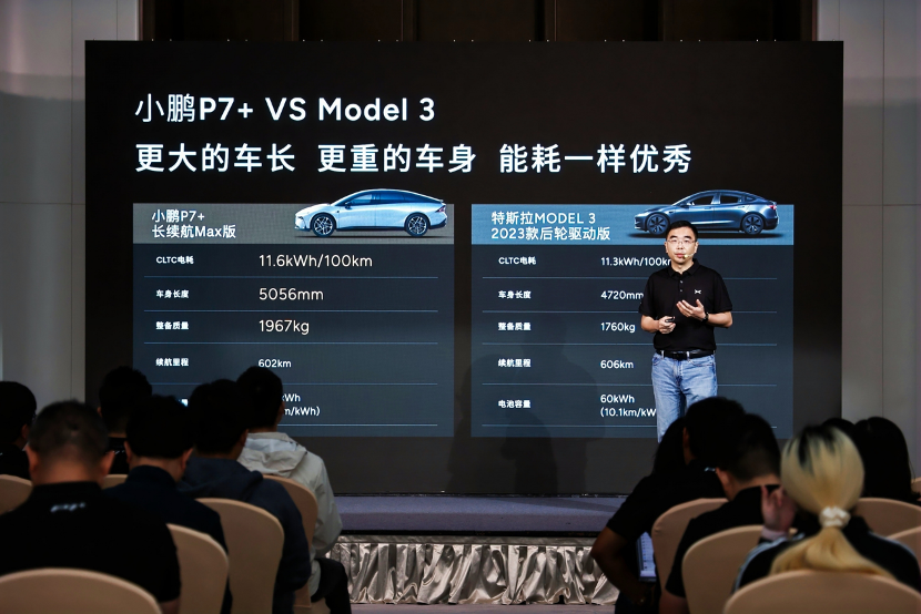 在车身长度比特斯拉Model 3后轮驱动版长336mm,整备质量多207kg的情况下,小鹏P7+的每百公里CLTC电耗只比前者高了0.3kWh。但这个差值可能会被抹平,顾捷在小鹏P7+三电技术沟通会上说,不只是智能驾驶,续航也能通过OTA升级。
