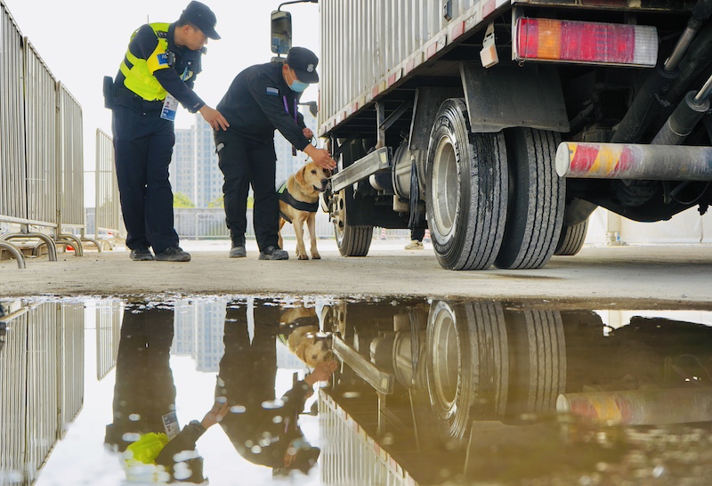 10月30日上午9时,记者在位于明珠路的P24远端安检点看到,一辆辆货车正井然有序地按照现场执勤民警及安保人员的指引进入蓄车区指定车道。货车到达远端安检点后,安检人员会先确认车辆证件、驾驶员证件是否无误,再将车辆引导至现场的6根安检车道。