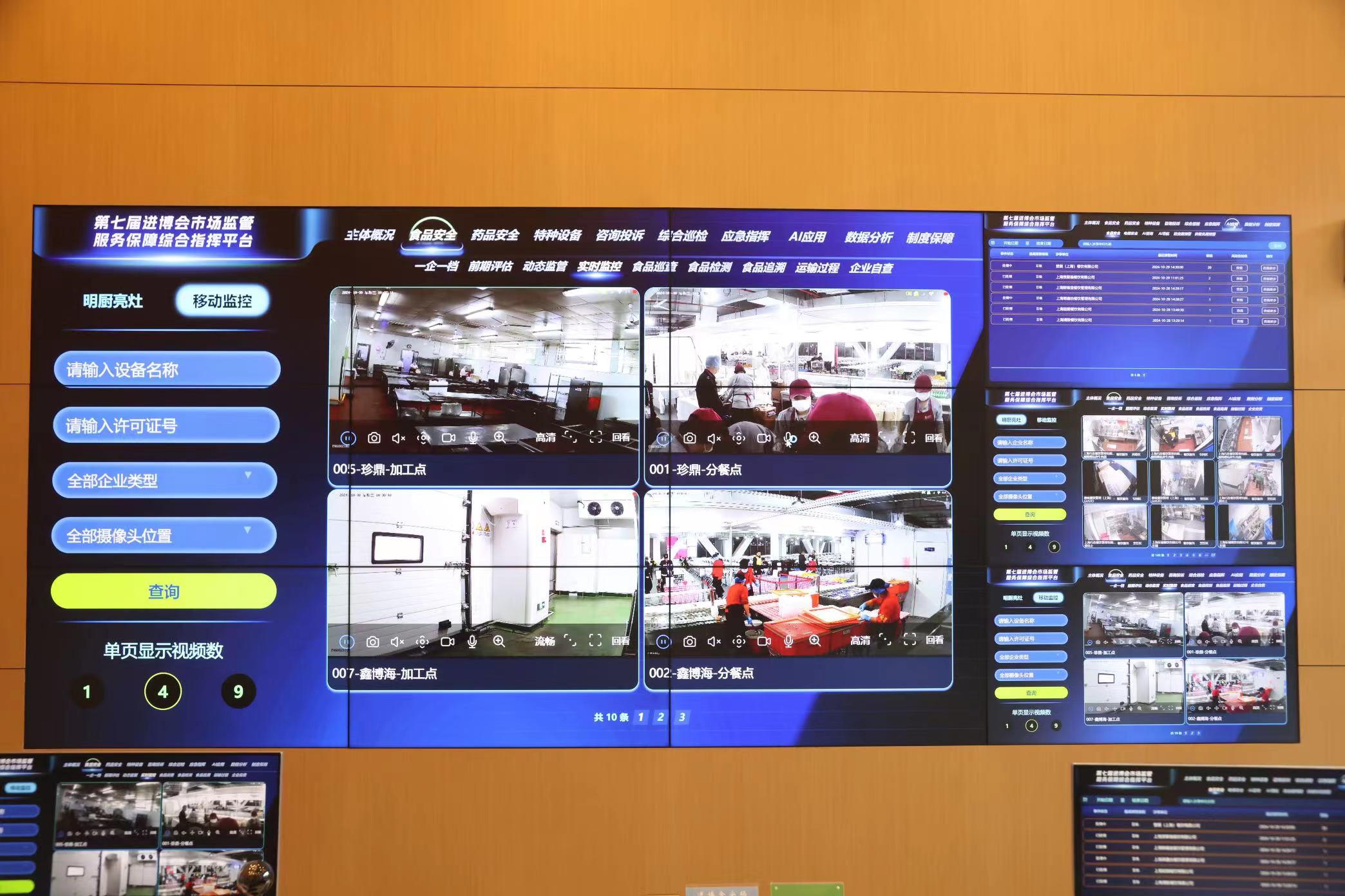 今年共计增加10个移动监控探头,分别对场内数家集中供餐单位及新闻中心临时供餐点位进行了移动监控设备安装,可360°翻转查看点位上的各方位情况,发现问题及时开展应急指挥调度。同时,升级扩容食品安全快检室,对食品及原料供应商加强食品检测,检测数据每日汇总进行大屏端展示,并对重点产品开展食品安全风险监测,实现食品安全快速预警、有效监管。