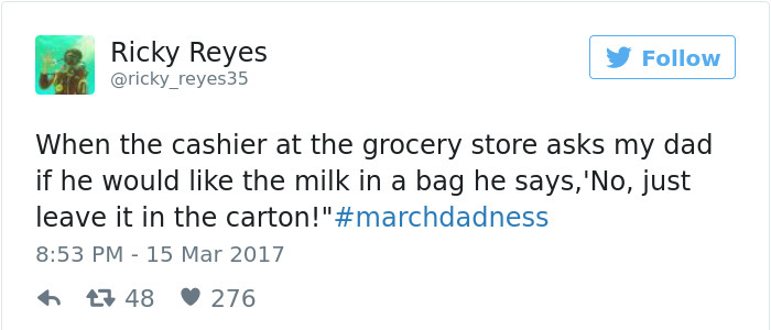 当收银员问我爸爸要不要用袋子装牛奶,他说,“不用,就留在纸盒里!”