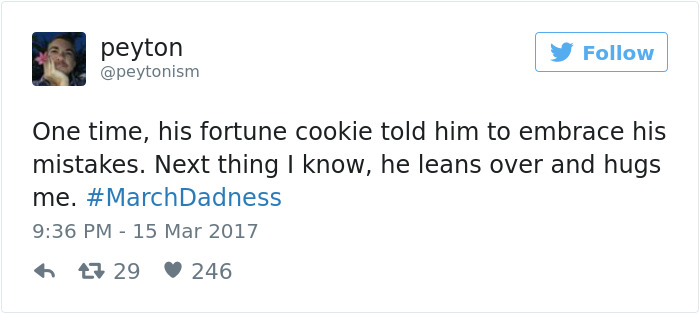 有一回,爸爸抽到一个幸运饼干,里面写着,让他坦然接受自己犯下的错误。然后,他就向我这边靠,认命般抱住我。