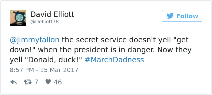 现在当总统有危险时,保镖不再喊:“蹲下”,而是会说“唐老鸭”(Donald Duck亦有“唐纳德,蹲下”之意)。