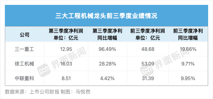 据界面新闻统计,三家工程机械上市龙头中,三一重工(600031.SH)三季度及前三季度净利同比增幅均最高。其中,前三季度净利达48.68亿元,同比增幅达19.66%。三季度净利达12.95亿元,同比增长超96%,但环比略有下降,表现不如前两个季度。