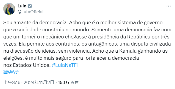 在距离美国大选还有四天之际,巴西总统卢拉当地时间11月1日在社交平台上表示,他认为美国民主党总统候选人、副总统卡玛拉·哈里斯当选会更加有利于巩固美国的民主。