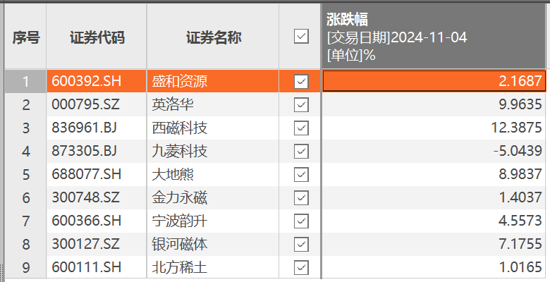 11月4日开盘,盛和资源(600392.SH)、英洛华(000795.SZ)竞价涨停,西磁科技(836961.BJ)、九菱科技(873305.BJ)涨超10%,大地熊(688077.SH)、金力永磁(300748.SZ)、宁波韵升(600366.SH)、银河磁体(300127.SZ)、北方稀土(600111.SH)等多股涨超5%。