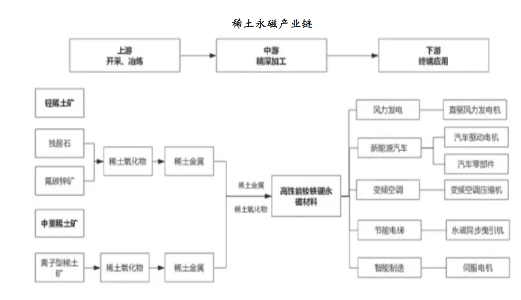 界面新闻了解到,上游为开采和冶炼分离,中游为精深加工,下游是以新能源汽车电机为代表的应用领域。钕铁硼永磁材料属于中游精深加工环节。