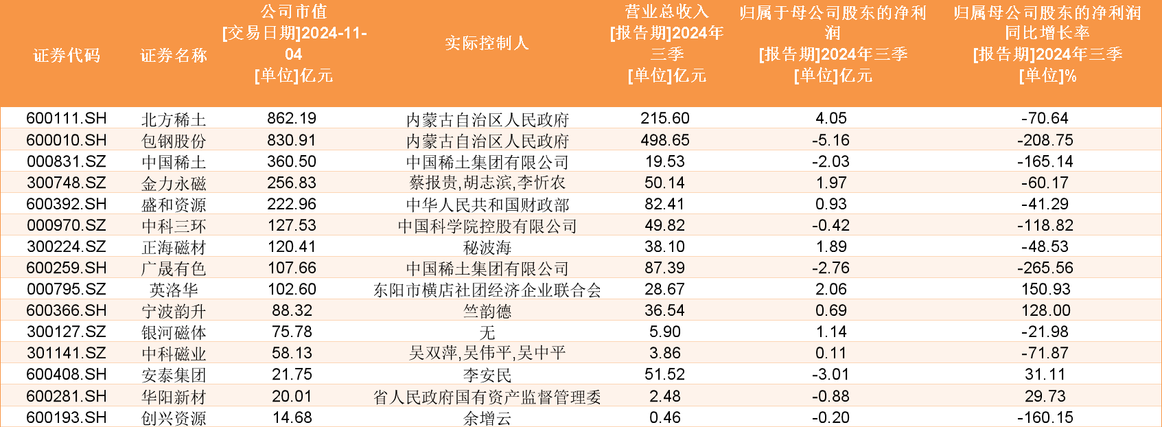 作为稀土龙头,市值高达860亿元的北方稀土利润大幅下滑。2024年前三季度公司实现营业收入215.6亿元,同比下降13.50%;归母净利润4.05亿元,同比下降70.64%;扣非净利润2.66亿元,同比下降80.08%。