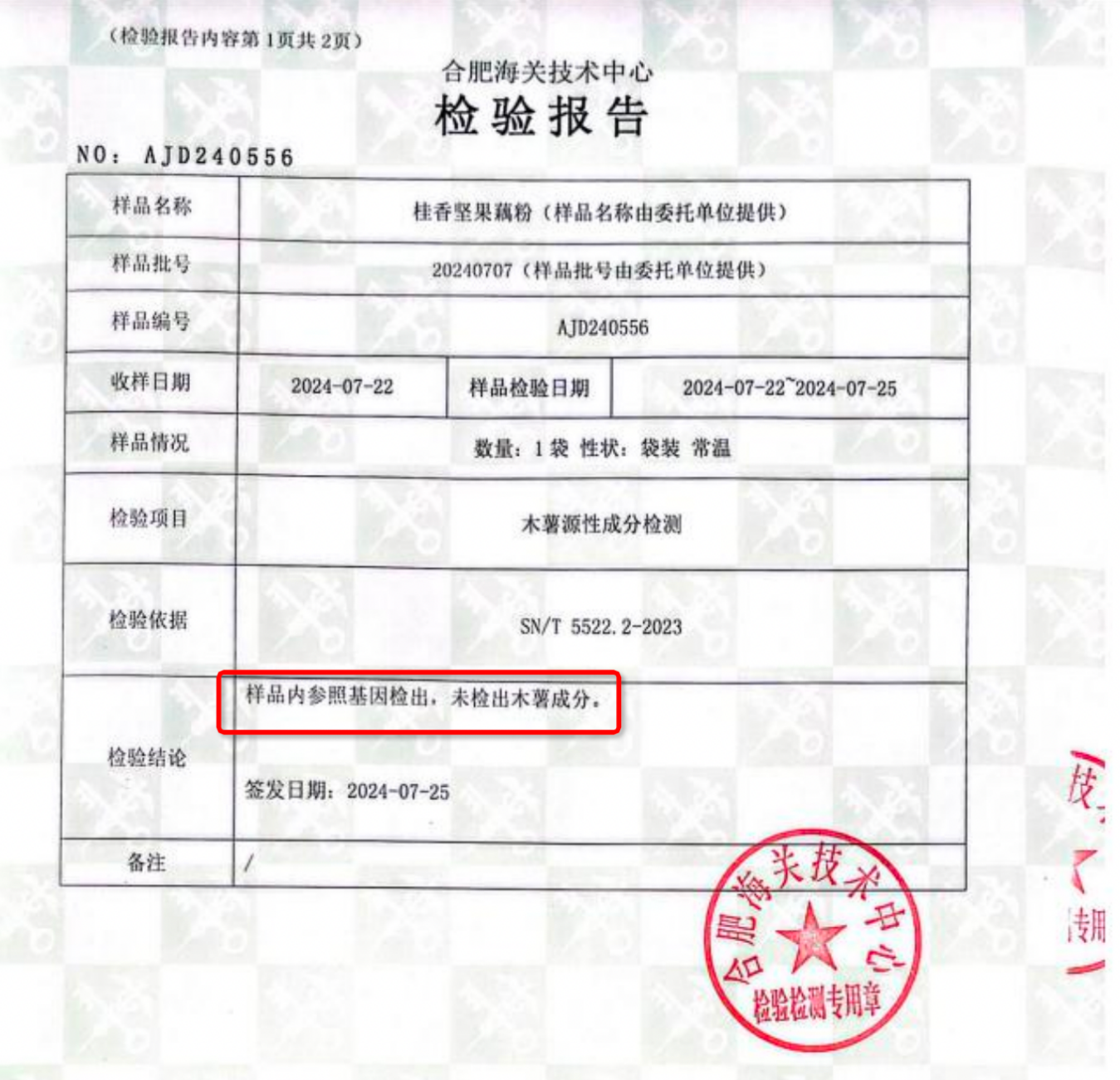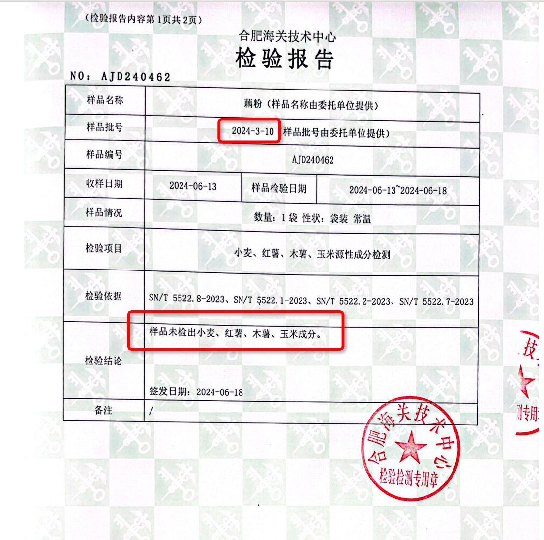 为此良品铺子在11月4日晚对界面新闻解释称,“相关博主所诉藕粉(供应商)分别于2024年6月、7月、9月送检不同的检测机构,进行包括特定基因成分鉴定在内的多项检验,检验结论:未检出木薯成分;其中6月送检产品批次为2024-3-10”。