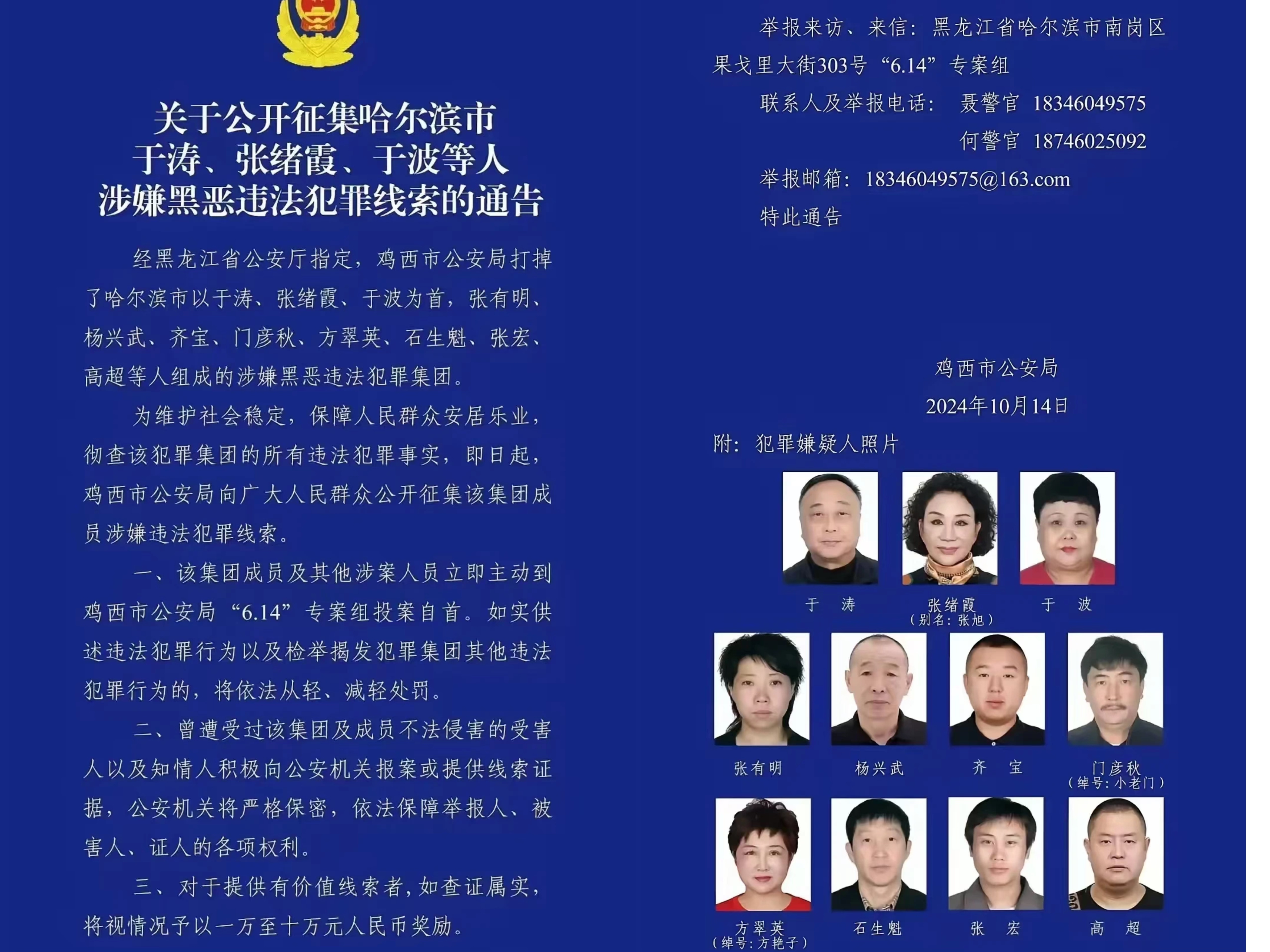 10月14日,黑龙江省鸡西市公安局发布一则线索征集通告:经黑龙江省公安厅指定,鸡西市公安局打掉了哈尔滨市以于涛、张绪霞、于波为首,张有明、杨兴武等人组成的涉嫌黑恶违法犯罪集团。即日起,向广大人民群众征集该集团成员涉嫌违法犯罪线索。