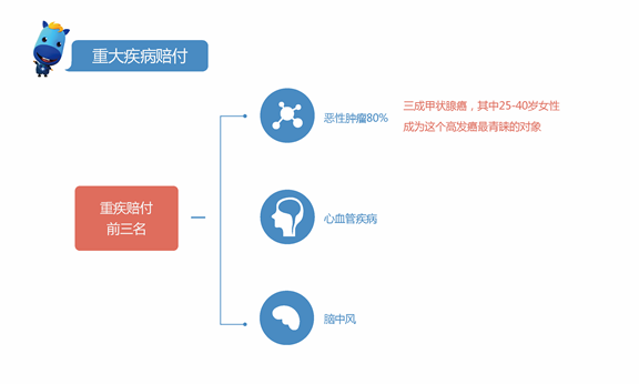 慧择大数据显示,甲状腺癌的发病率近年明显上升,其中约有三成的恶性肿瘤赔付均是甲状腺癌导致,而25-40岁女性成了这个高发癌最青睐的对象。有分析指出,体内雌激素水平越高,越有助于甲状腺疾病的发生。女性到25岁-45岁时,雌激素水平处于一个高位,尤其是40岁左右女性为高发群体。再加上年轻女性情绪不稳定、精神压力大、晚育等情况,导致内分泌紊乱,更容易受到癌细胞的侵袭。