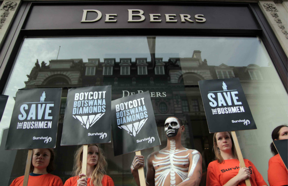 正当人们以为形势一片大好时,De Beers却遭到非盈利组织“国际生存者(Survival International)”的抨击。后者指责De Beers为了开采钻石资源,将非洲东部国家博茨瓦那的原住民布须曼人强行迁至别处。一些与之合作的国际名模,比如Iman, Lily Cole和Erin O'Connor在丑闻压力下,开始调头支持抗议活动。