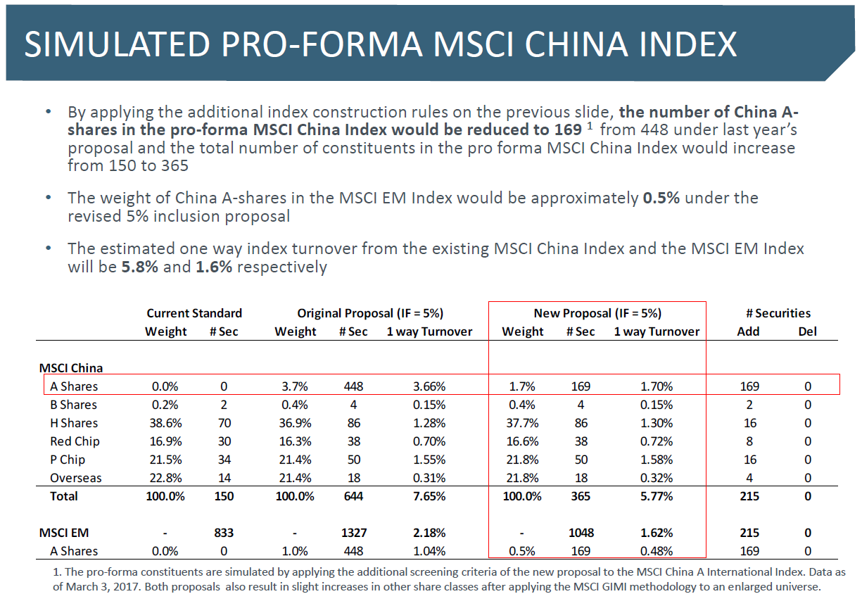 不过,根据MSCI文件,该公司提出一项有关将中国A股纳入全球指数的缩小化方案,将股票数量从448只减少到169只,减幅达62%。建议只纳入可通过沪港通和深港通买卖的大盘股,计划将A股在MSCI中国指数的建议权重从3.7%降至1.7%,在MSCI新兴市场指数中的权重从1%降至0.5%。
