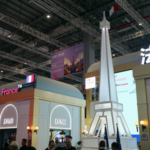 界面新闻记者在现场看到,法国馆内复刻了法国经典地标性建筑,包括醒目的埃菲尔铁塔、红磨坊风车,以及彰显巴黎建筑魅力的奥斯曼风格精品店。老佛爷百货、LVMH、欧莱雅、达能等法国知名品牌以店中店的形式入驻。观众穿行其中,仿佛漫步在浪漫的巴黎街头。