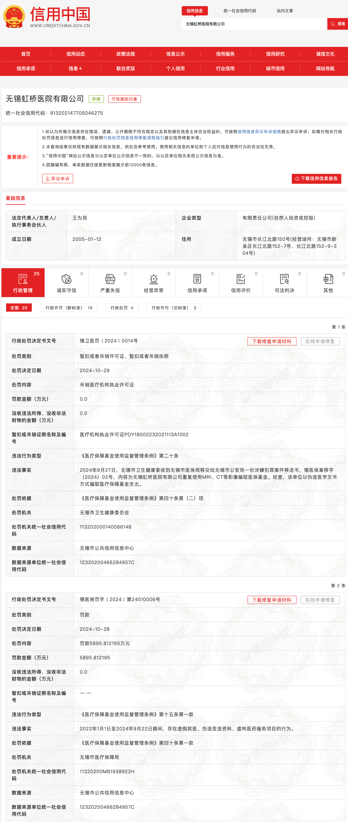 处罚决定日期为10月28日的行政处罚决定书显示,无锡虹桥医院有限公司违法事实为:“2022年1月1日至2024年9月22日期间,存在虚假就医、伪造变造资料、虚构医药服务项目的行为。”该公司被处以罚款58958121.95元。