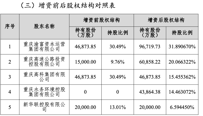据了解,新增资金拟由重庆渝富资本运营集团有限公司出资5亿元,重庆高速公路投资控股有限公司出资4.6亿元,重庆水务环境控股集团有限公司出资4.4亿元,重庆三峡国有资本运营集团有限公司出资1亿元,其中:重庆水务环境控股集团有限公司和重庆三峡国有资本运营集团有限公司是本次增资新增股东。