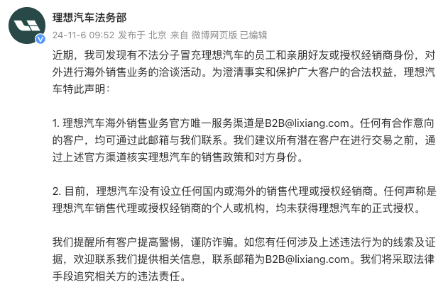 11月6日,理想汽车法务部发布声明称,理想汽车海外销售业务官方唯一服务渠道是B2B@lixiang.com。目前,理想汽车没有设立任何国内或海外的销售代理或授权经销商。任何声称是理想汽车销售代理或授权经销商的个人或机构,均未获得理想汽车的正式授权。