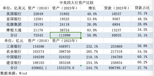 一是欧美大银行资产增速低,降低了发展的资本压力。Wind数据显示,2023年末美国四大行资产规模合计为11.4万亿美元,相比2010年增长50%,年均增速仅4%。
