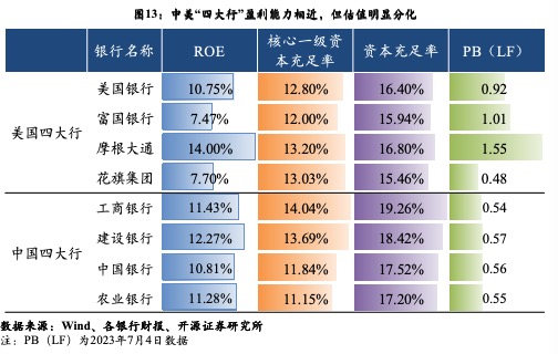 据开源证券的数据,2022年中资四大行ROE水平均在10%以上,美国四大行中摩根大通和美国银行ROE超10%,富国银行和花旗集团在7%左右。中资四大行资本充足率明显高于美国四大行,但中资银行核心一级资本充足率出现明显分化,中国银行和农业银行低于美国四大行平均水平。
