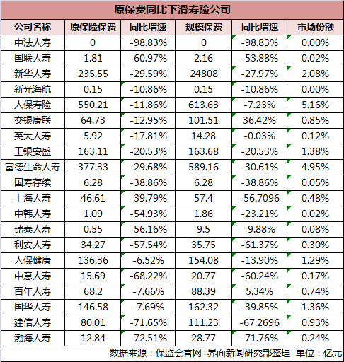 当然,有人突飞猛进便有人倒退下滑。27%的寿险公司原保险保费出现下滑,数量多达20家。原保费收入下滑的多为市场份额不到1%的小险企,下降最快的是中法人寿,同比下降98%,建信人寿、渤海人寿降幅亦超过70%。