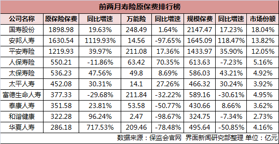 界面新闻整理出原保险保费排名前十的寿险公司,单个公司来看国寿股份仍居第一。不过,市场往往以安邦系三家公司(安邦人寿、和谐健康、安邦养老)合计保费来看待巨头之争,安邦系前两月合计实现原保险保费收入1954.68亿元,以不到百亿之优超越国寿股份坐上传统寿险的第一把交椅。