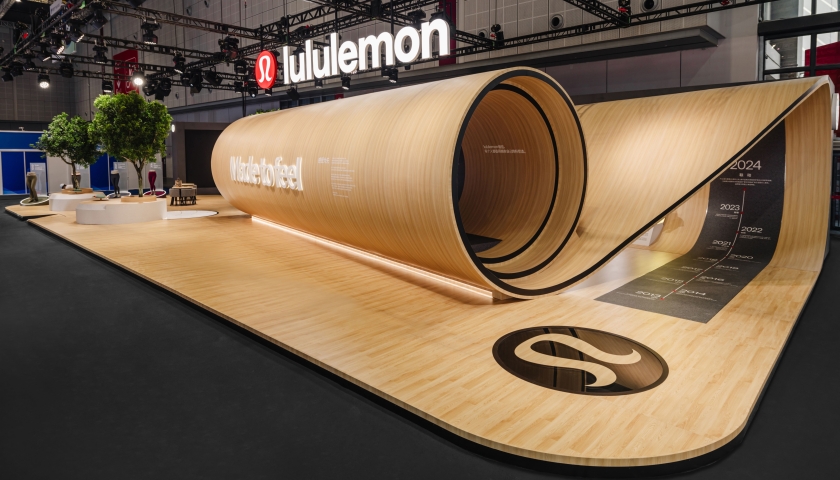 2024年11月6日,加拿大运动生活方式品牌lululemon开启了自己的中国国际进口博览会首秀,其展台设计以品牌起家的瑜伽运动为灵感。