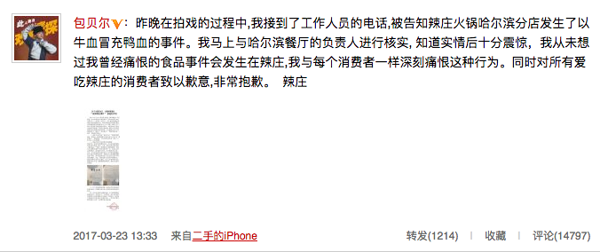 今天,该事件了新的进展,3月23日中午,包贝尔经过核实后在微博上发表声明,为此事郑重向广大消费者道歉。包贝尔表示,他本人十分反感食品安全事故,对辣庄发生了这样的事感到很震惊,并在文中写道:“我对产品的监督不严及管理上的漏洞深感自责……想对那些因为我走进餐厅的消费者诚恳的致歉……”包贝尔表示,今后他会加强对辣庄火锅的运营与管理进一步加强监管,愿意接受大众的监督。