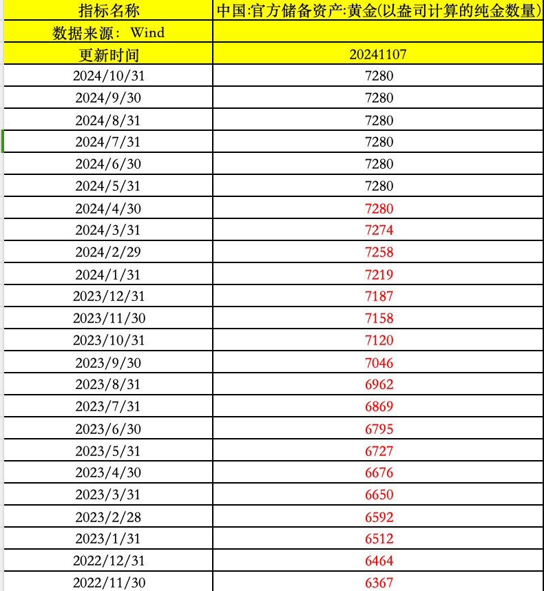 11月7日,央行数据显示,中国10月末黄金储备报7280万盎司,与上个月持平,这也是央行连续第六个月暂停增持黄金。