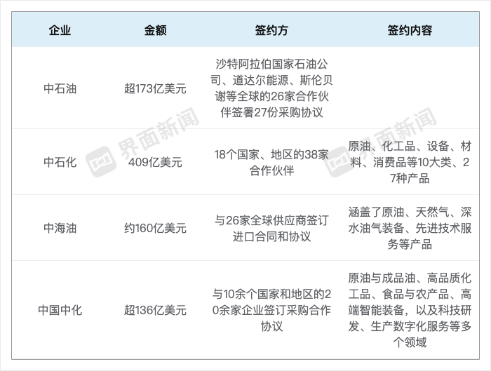 本届进博会期间,多家能源央企抛出千亿资金“扫货”,中石化以409亿美元(约合人民币2921亿元)的大单领跑,签约内容涉及原油、化工品、设备、材料、消费品等10大类、27种产品。中石油、中海油和中国中化的签约金额也达到了百亿美元级别。