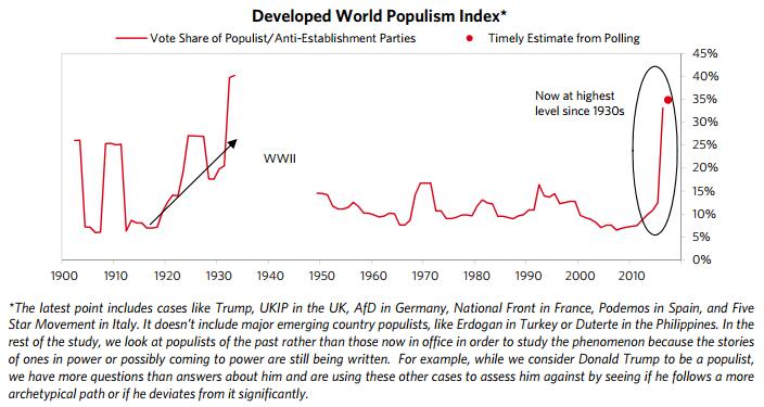 民粹主义塑造经济环境的影响力可能比经典的货币和财政政策更大。未来一年左右,我们将了解更多,因为那些目前在位的民粹主义者将显示他们是多传统的民粹主义者,多场选举将决定还有多少民粹主义者会当政。