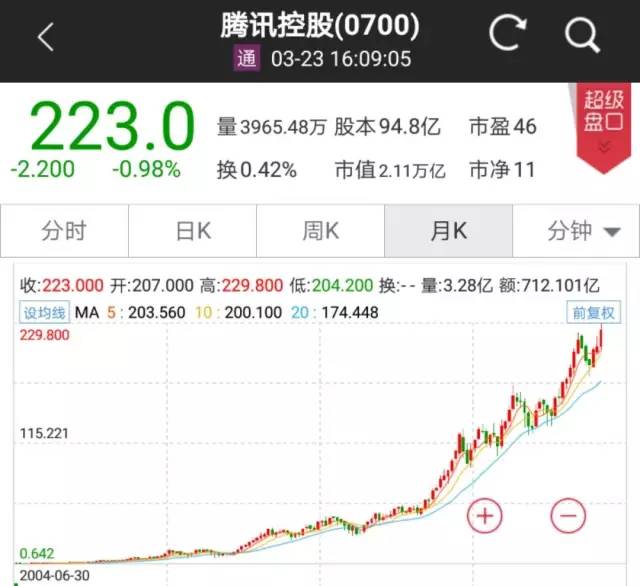我们再一起来欣赏下腾讯控股上市以来的股价走势!拥有如此完美的K线图,是每一位投资者梦想。