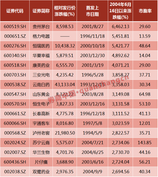 涨幅冠军由贵州茅台摘得,涨幅高达64.62倍,亚军是格力电器,涨幅为54.52倍,第三名则由恒瑞医药获得,涨幅为54.22倍;