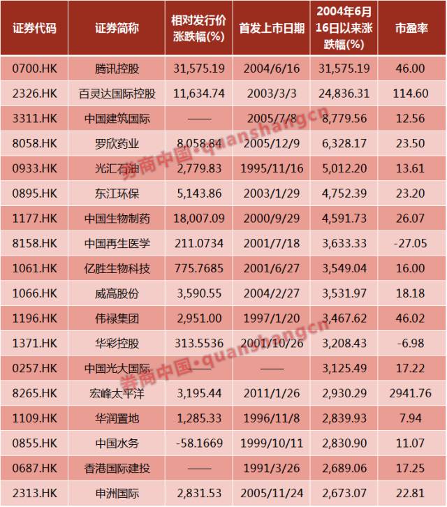 如果仅按照投资收益来看,股票市场也有不少金子,足可以让各地的房价黯然失色。以腾讯上市日2004年6月16日为节点来计算,涨幅超过30倍个股不在少数。