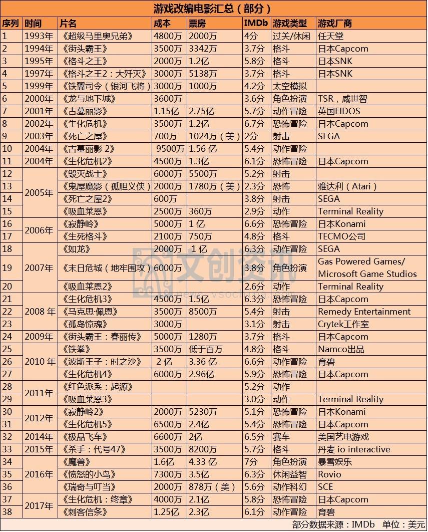 1993年,由热门游戏《超级玛丽》改编的《超级马里奥兄弟》问世,开启了游戏改编电影的篇章。随后,《生化危机》系列、《古墓丽影》系列、《静寂岭》系列、《街头霸王》系列、《极品飞车》、《魔兽》、《愤怒的小鸟》、《刺客信条》游戏作品纷纷被改编电影。据文创资讯粗略统计,24年来至少有38部游戏改编电影作品出现。