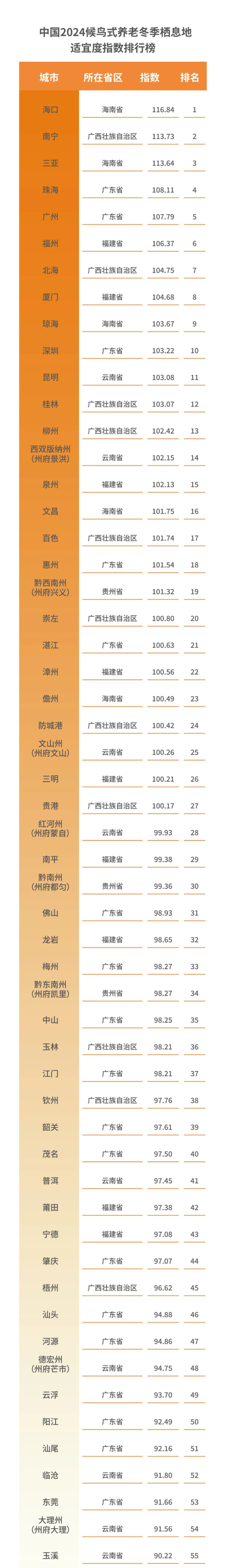 11月7日,上海交通大学安泰经济与管理学院发布《2024中国候鸟式养老冬季栖息地适宜度指数》,海口以116.84分的综合成绩排名第一,第二名被南宁赢得,传统避寒胜地三亚表现依然不俗,位列第三。第四到十名分别是珠海、广州、福州、北海、厦门、琼海、深圳。前十强之中按区域来看,海南省和广东省入围城市最多,各有3城,广西省和福建省各占两城。
