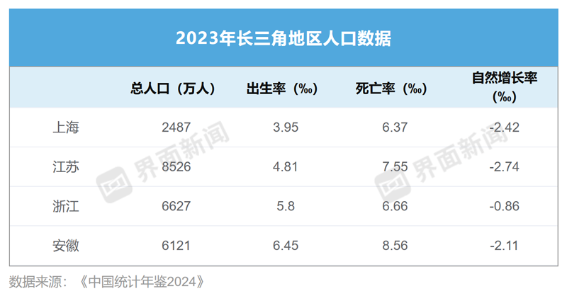 界面新闻记者梳理发现,2023年长三角三省一市的人口自然增长率均为负。其中,上海总人口2487万人,出生率为3.95‰,人口自然增长率为-2.42‰;江苏省总人口8526万人,出生率为4.81‰,人口自然增长率为-2.74‰;浙江省总人口为6627万人,出生率为5.8‰,人口自然增长率为-0.86‰;安徽省总人口为6121万人,出生率为6.45‰,人口自然增长率为-2.11‰。