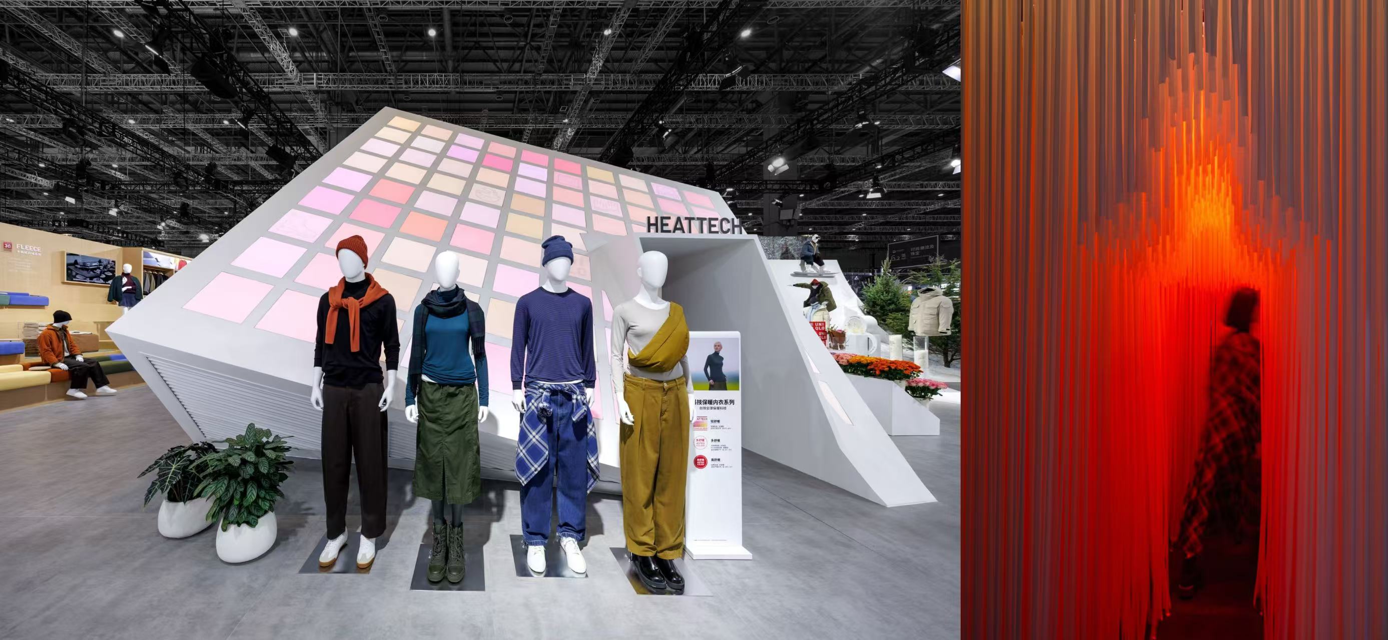 同时,优衣库的HEATTECH保暖内衣也备受瞩目。通过天然纤维与先进纺织技术的结合,多重纤维黄金比例编织工艺使得这款内衣兼具吸湿、发热、保温与弹性。穿上它,就像给身体穿上了一层温暖的贴身防护,让人在秋冬时节也能保持舒适与温暖。在沉浸式热力成像密道,观众可以随着步伐的移动,感受到如同HEATTECH商品般的动态智暖,温暖随行。