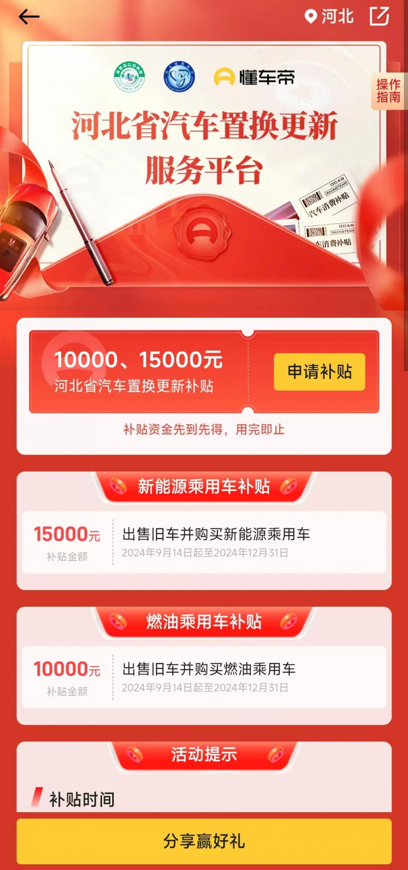 在全国报废更新补贴的基础上,9月14日,河北省商务厅等7部门发布《进一步推动汽车以旧换新工作方案》。2024年9月14日0时至2024年12月31日24时,在河北省内卖旧车买新能源乘用车补贴1.5万元,卖旧车买燃油乘用车补贴1万元。消费者登录懂车帝App搜索“河北省汽车置换更新补贴”即可参与活动。