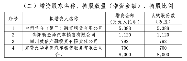 同时新增三家股东,分别为中恒信合(厦门)融资租赁有限公司、邵阳新金泽汽车销售有限公司及东营泛华丰田汽车销售服务有限公司。三家公司的认购股份数分别为1120万股、792万股、700万股,分别将持股4.99%、1.04%、0.65%。
