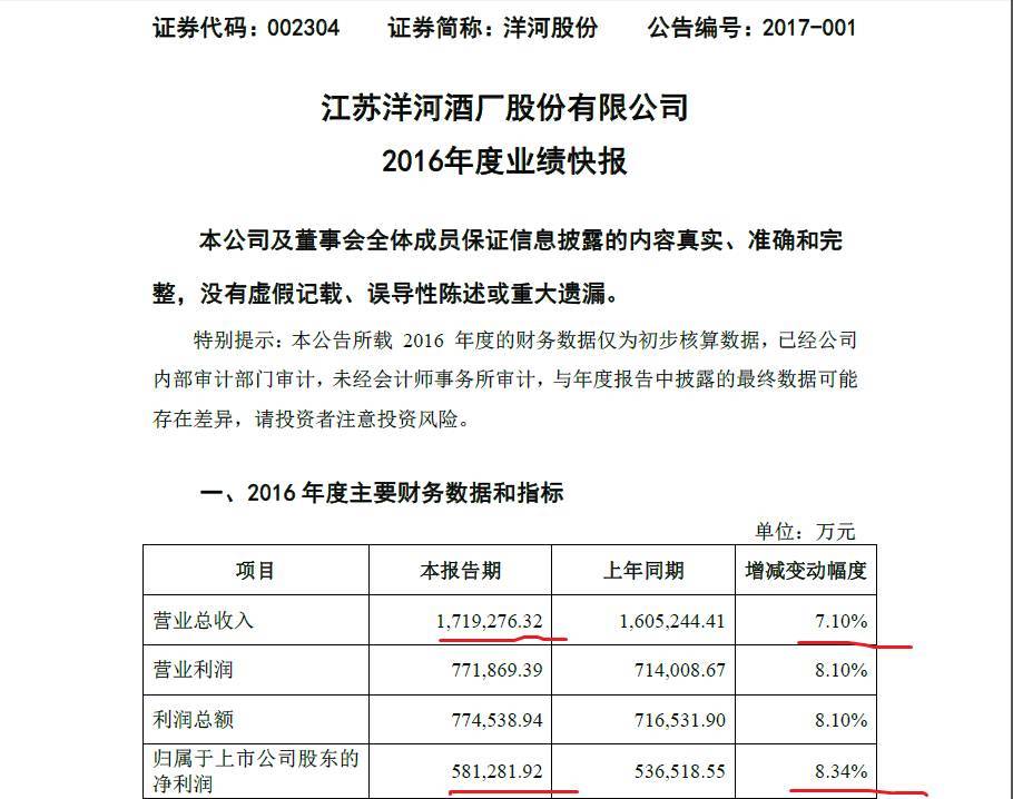 日前,洋河股份在深交所公布了2016年业绩快报,实现营业总收入接近171.93亿元,和2015年约为160.52亿元相比,增长7.1%;归属于上市公司股东的净利润约为58.13亿元,相较于2015年53.65亿元,增幅在8%左右。
