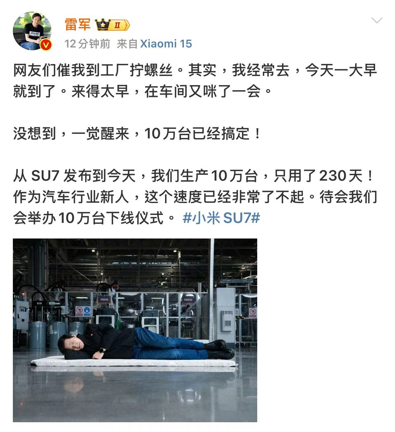 小米集团董事长雷军11月13日表示,从SU7发布到今天,生产10万台,只用了230天。会举办10万台下线仪式。