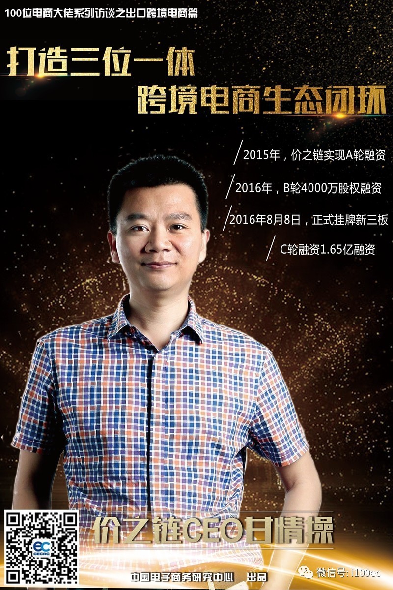 近年来,受益于政策、环境、资本等助力,跨境电商蓬勃发展。在出口跨境电商市场,各大平台纷纷帮助外贸企业由代工向品牌转型,强化终端营销与体验。而整个行业存在什么问题、竞争情况如何等?对此,电商门户、互联网+智库——中国电子商务研究中心(100EC.CN)启动了100位电商大佬系列之出口跨境电商独家系列调研访谈,截止目前,我们已邀请了全球速卖通、敦煌网、Wish、eBay、大龙网、有棵树、百事泰、小笨鸟、价之链、环球市场、卓志等等出口跨境电商大佬参与访谈,共同分享创业经历,探寻行业前景。今天,我们邀请到的是新三板挂牌企业价之链CEO甘情操的独家对话。