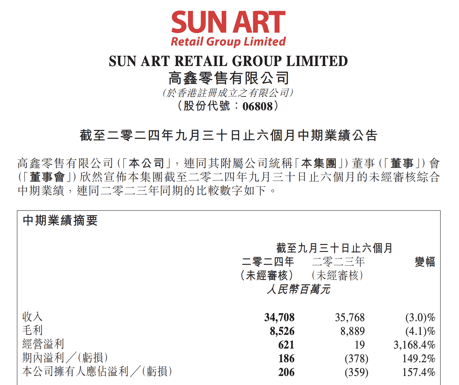 11月12日,大润发母公司高鑫零售发布了截至2024年9月30日止2025财年中期业绩报告。公告显示,报告期内高鑫零售集团共实现营收340.08亿,同比357.68亿下降2.96%,相对年度13.3%的营收下降,降幅有收窄;归属公司股东净利润2.06亿,同比-3.59亿提升157.4%,盈利状况极大改善。