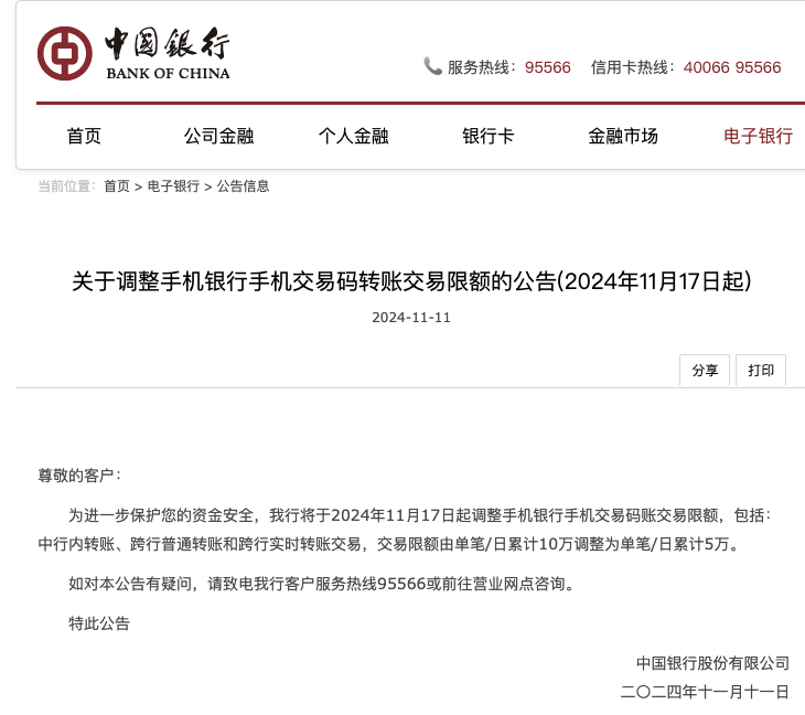 11月13日,根据中国银行公告,为进一步保护客户的资金安全,该行将于2024年11月17日起调整手机银行手机交易码转账交易限额,包括:中行内转账、跨行普通转账和跨行实时转账交易,交易限额由单笔/日累计10万调整为单笔/日累计5万。