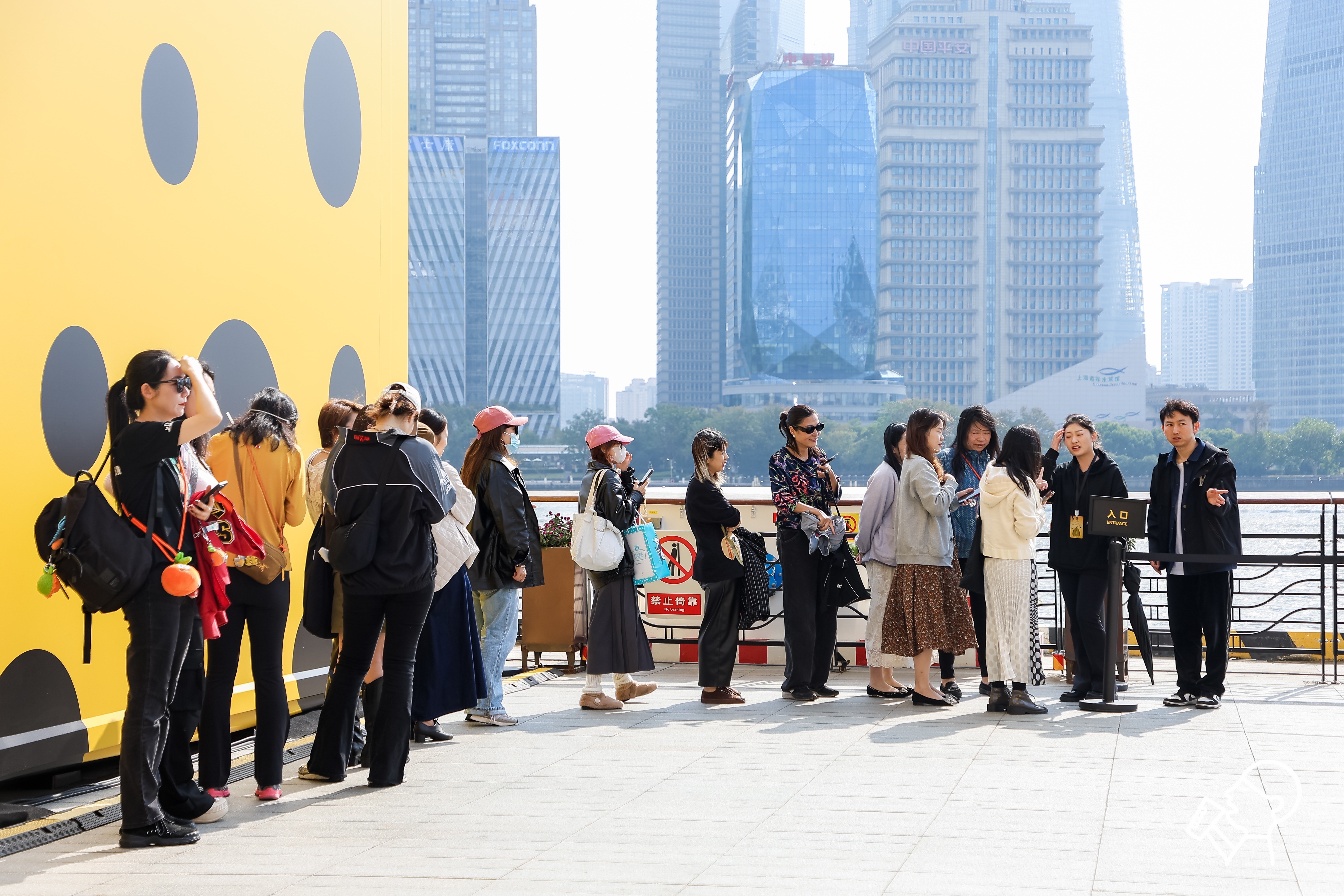 这场展览一开放就约满了,最近去到上海北外滩国客中心码头的人们也会发现,周边充斥着与波点装置拍照打卡的人群。