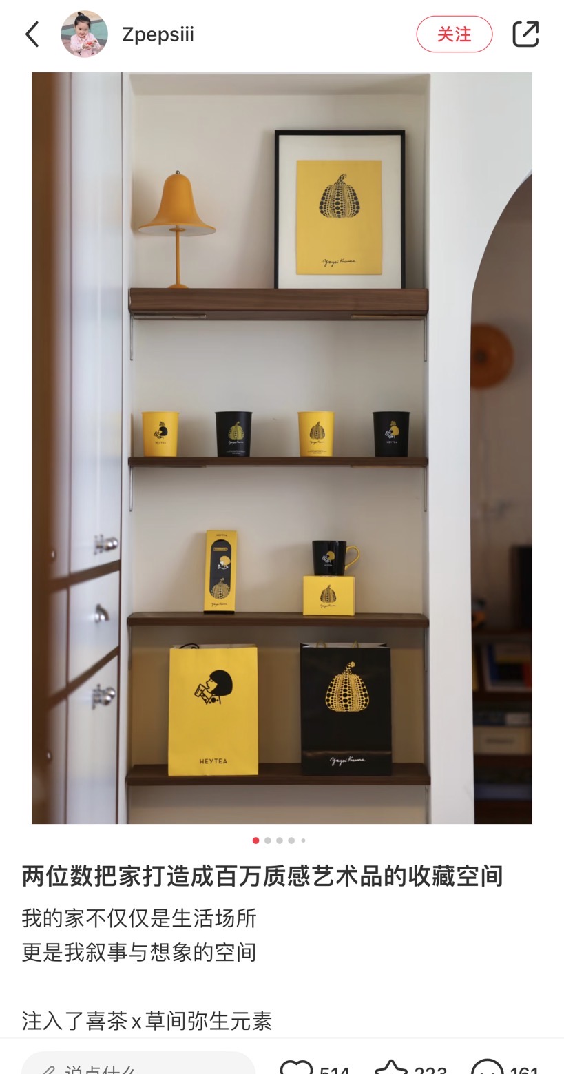 社交平台小红书上,一位网友晒出了家中一角,而她整齐摆放在展柜上的,是一套喜茶与草间弥生联名的马克杯、奶茶杯等周边产品。那个原本用来装奶茶的纸袋,甚至被仔细用画框装裱,让黄色背景与黑色波点组成的南瓜图样立刻变身成为一副现代艺术画作。